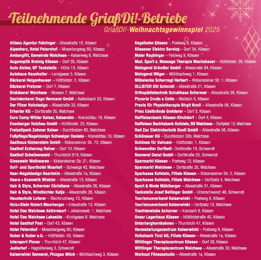 An der Verlosung am 29.12.2025 nehmen alle vollständig ausgefüllten Teilnahmekarten mit 6 deutlich erkennbaren GriaßDi!-Stempeln verschiedener GriaßDi!-Betriebe teil. Letzter Abgabetermin ist der Ladenschluss des teilnehmenden Betriebes vor Weihnachten. Nur ein GriaßDi!-Stempel pro Einkauf. Teilnahme ab 15 Jahren. Maximal ein Gewinn (der zuerst gezogene) pro Teilnehmer. Der Teilnehmer erklärt sich mit der Speicherung seiner Daten für GriaßDi!-Aktionen einverstanden. Eine Weitergabe der Daten an Dritte findet nicht statt. Keine Barablöse. Der Rechtsweg ist ausgeschlossen.